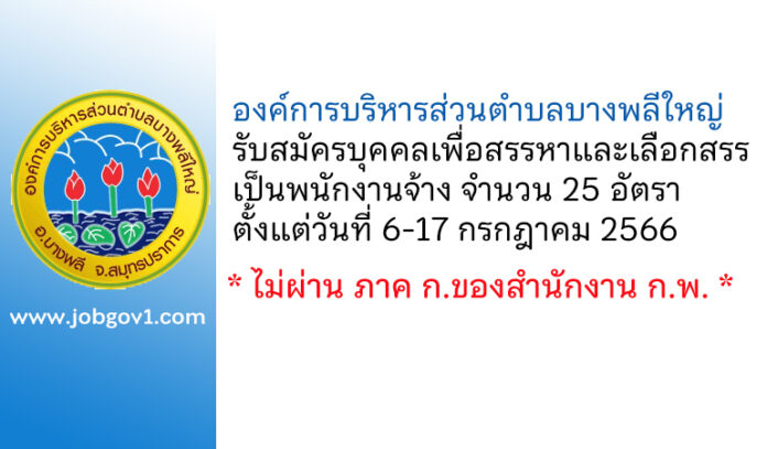 องค์การบริหารส่วนตำบลบางพลีใหญ่ รับสมัครบุคคลเพื่อสรรหาและเลือกสรรเป็นพนักงานจ้าง 25 อัตรา ตั้งแต่วันที่ 6-17 กรกฎาคม 2566