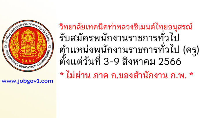 วิทยาลัยเทคนิคท่าหลวงซิเมนต์ไทยอนุสรณ์ รับสมัครพนักงานราชการทั่วไป ตำแหน่งพนักงานราชการทั่วไป (ครู) ตั้งแต่วันที่ 3-9 สิงหาคม 2566