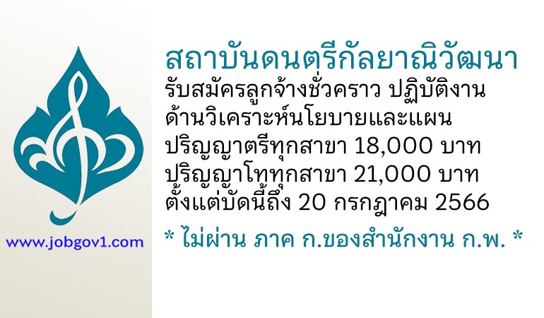 สถาบันดนตรีกัลยาณิวัฒนา รับสมัครลูกจ้างชั่วคราว ปฏิบัติงานด้านวิเคราะห์นโยบายและแผน ตั้งแต่บัดนี้ถึง 20 กรกฎาคม 2566