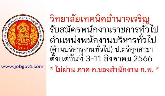 วิทยาลัยเทคนิคอำนาจเจริญ รับสมัครพนักงานราชการทั่วไป ตำแหน่งพนักงานบริหารทั่วไป (ด้านบริหารงานทั่วไป) ตั้งแต่วันที่ 3-11 สิงหาคม 2566