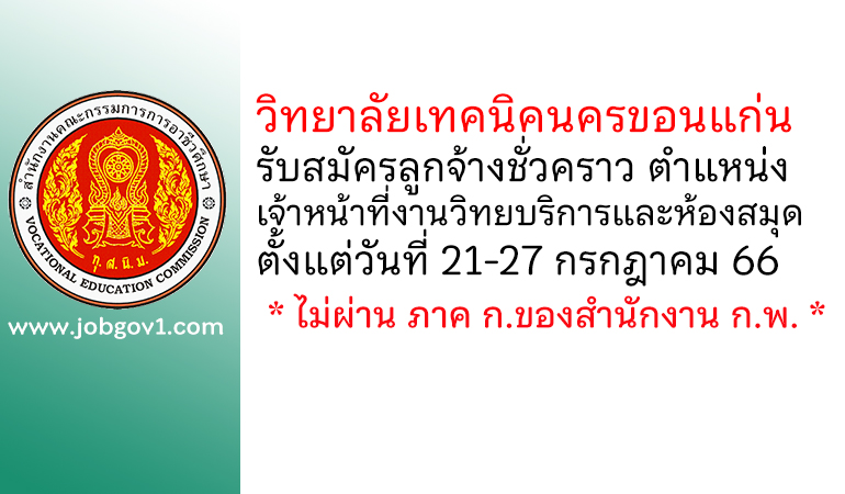 ประกาศวิทยาลัยเทคนิคนครขอนแก่น เรื่อง การรับสมัครสอบคัดเลือกลูกจ้างชั่วคราว ตำแหน่ง เจ้าหน้าที่งานวิทยบริการและห้องสมุด ประจำปีงบประมาณ 2566