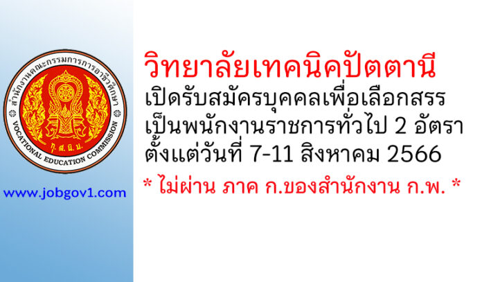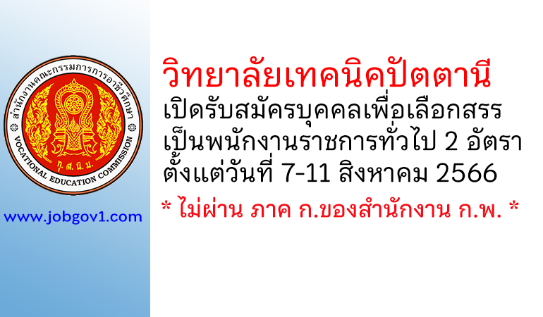 วิทยาลัยเทคนิคปัตตานี รับสมัครบุคคลเพื่อเลือกสรรเป็นพนักงานราชการทั่วไป 2 อัตรา ตั้งแต่วันที่ 7-11 สิงหาคม 2566