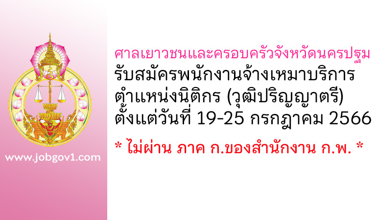 ศาลเยาวชนและครอบครัวจังหวัดนครปฐม รับสมัครพนักงานจ้างเหมาบริการ ตำแหน่งนิติกร ตั้งแต่วันที่ 19-25 กรกฎาคม 2566