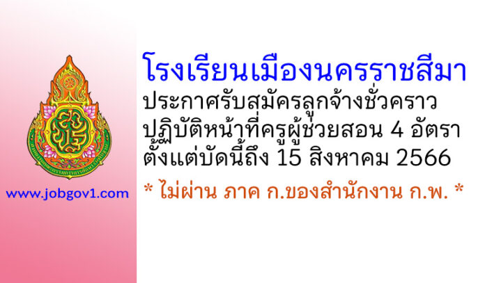 โรงเรียนเมืองนครราชสีมา รับสมัครลูกจ้างชั่วคราว ปฏิบัติหน้าที่ครูผู้ช่วยสอน 4 อัตรา ตั้งแต่บัดนี้ถึง 15 สิงหาคม 2566