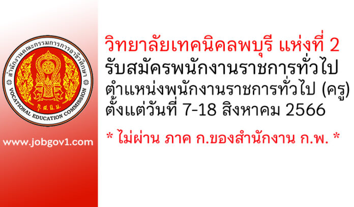 วิทยาลัยเทคนิคลพบุรี แห่งที่ 2 รับสมัครพนักงานราชการทั่วไป ตำแหน่งพนักงานราชการทั่วไป (ครู) ตั้งแต่วันที่ 7-18 สิงหาคม 2566