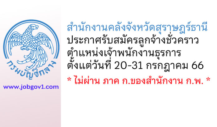 สำนักงานคลังจังหวัดสุราษฎร์ธานี รับสมัครลูกจ้างชั่วคราว ตำแหน่งเจ้าพนักงานธุรการ ตั้งแต่วันที่ 20-31 กรกฎาคม 2566