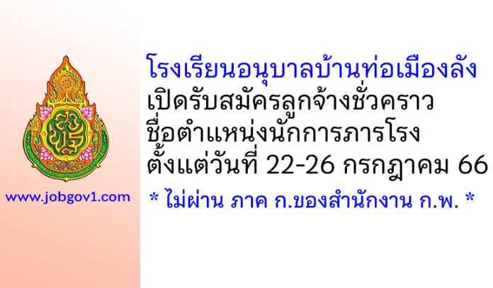โรงเรียนอนุบาลบ้านท่อเมืองลัง รับสมัครลูกจ้างชั่วคราว ตำแหน่งนักการภารโรง ตั้งแต่วันที่ 22-26 กรกฎาคม 2566