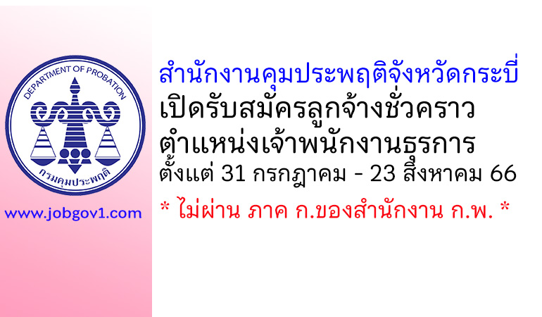 สำนักงานคุมประพฤติจังหวัดกระบี่ รับสมัครลูกจ้างชั่วคราว ตำแหน่งเจ้าพนักงานธุรการ ตั้งแต่ 31 กรกฎาคม – 23 สิงหาคม 2566