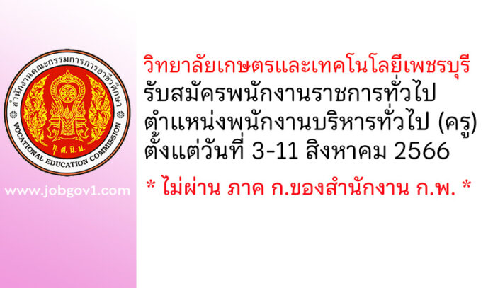 วิทยาลัยเกษตรและเทคโนโลยีเพชรบุรี รับสมัครพนักงานราชการทั่วไป ตำแหน่งพนักงานบริหารทั่วไป (ครู) ตั้งแต่วันที่ 3-11 สิงหาคม 2566