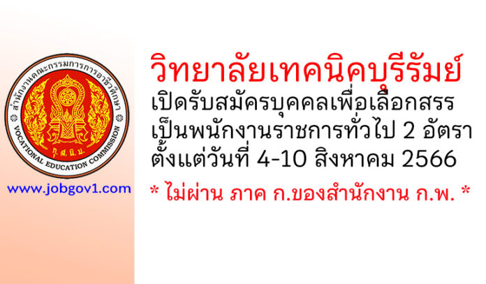 วิทยาลัยเทคนิคบุรีรัมย์ รับสมัครบุคคลเพื่อเลือกสรรเป็นพนักงานราชการทั่วไป 2 อัตรา ตั้งแต่วันที่ 4-10 สิงหาคม 2566