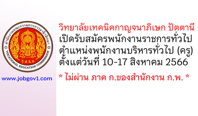 วิทยาลัยเทคนิคกาญจนาภิเษก ปัตตานี รับสมัครพนักงานราชการทั่วไป ตำแหน่งพนักงานบริหารทั่วไป (ครู) ตั้งแต่วันที่ 10-17 สิงหาคม 2566