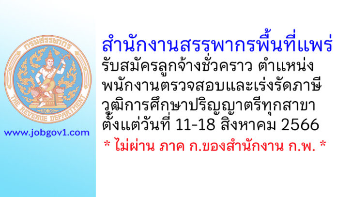 ประกาศสำนักงานสรรพากรพื้นที่แพร่ เรื่อง รับสมัครสอบคัดเลือกเป็นลูกจ้างชั่วคราว ตำแหน่งพนักงานตรวจสอบและเร่งรัดภาษี ครั้งที่ 1 /2566