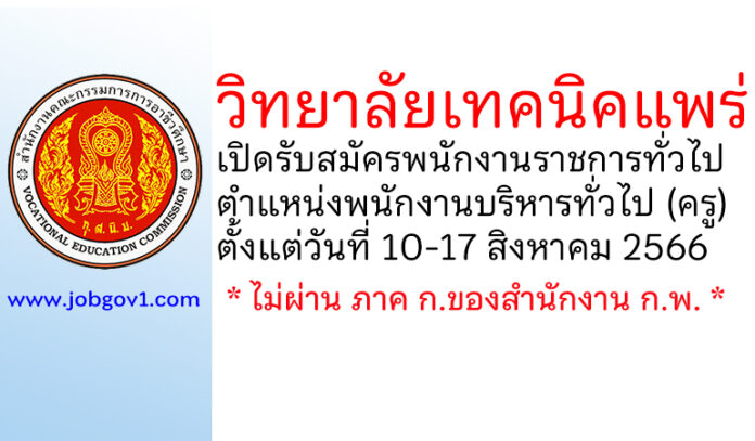 วิทยาลัยเทคนิคแพร่ รับสมัครพนักงานราชการทั่วไป ตำแหน่งพนักงานบริหารทั่วไป (ครู) ตั้งแต่วันที่ 10-17 สิงหาคม 2566