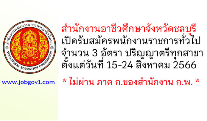 สำนักงานอาชีวศึกษาจังหวัดชลบุรี รับสมัครบุคคลเพื่อเลือกสรรเป็นพนักงานราชการทั่วไป 3 อัตรา ตั้งแต่วันที่ 15-24 สิงหาคม 2566