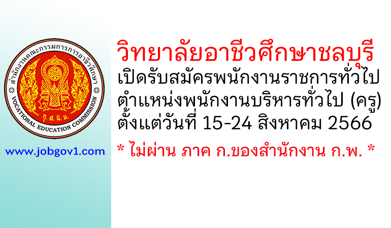 วิทยาลัยอาชีวศึกษาชลบุรี รับสมัครพนักงานราชการทั่วไป ตำแหน่งพนักงานบริหารทั่วไป (ครู) ตั้งแต่วันที่ 15-24 สิงหาคม 2566