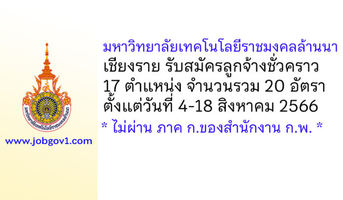 มหาวิทยาลัยเทคโนโลยีราชมงคลล้านนา เชียงราย รับสมัครลูกจ้างชั่วคราว 20 อัตรา ตั้งแต่วันที่ 4-18 สิงหาคม 2566