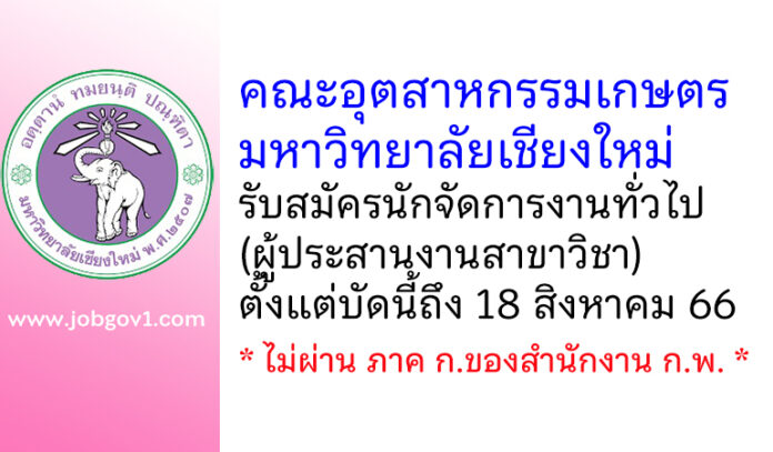 ประกาศคณะอุตสาหกรรมเกษตร มหาวิทยาลัยเชียงใหม่ เรื่อง รับสมัครบุคคลเพื่อสอบคัดเลือกเป็นพนักงานมหาวิทยาลัยชั่วคราว (พนักงานส่วนงาน) ตำแหน่งนักจัดการงานทั่วไป (ผู้ประสานงานสาขาวิชา)