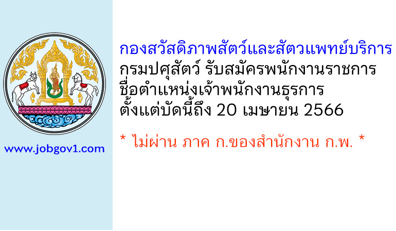 กองสวัสดิภาพสัตว์และสัตวแพทย์บริการ กรมปศุสัตว์ รับสมัครพนักงานราชการทั่วไป ตำแหน่งเจ้าพนักงานธุรการ ตั้งแต่บัดนี้ถึง 20 เมษายน 2566
