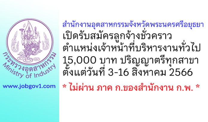 สำนักงานอุตสาหกรรมจังหวัดพระนครศรีอยุธยา รับสมัครลูกจ้างชั่วคราว ตำแหน่งเจ้าหน้าที่บริหารงานทั่วไป ตั้งแต่วันที่ 3-16 สิงหาคม 2566