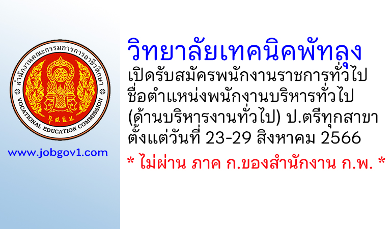 วิทยาลัยเทคนิคพัทลุง รับสมัครพนักงานราชการทั่วไป ตำแหน่งพนักงานบริหารงานทั่วไป (ด้านบริหารงานทั่วไป) ตั้งแต่วันที่ 23-29 สิงหาคม 2566
