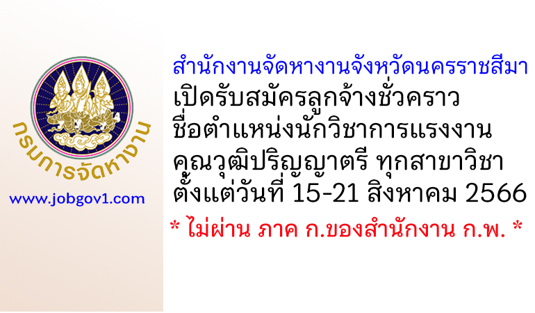 สำนักงานจัดหางานจังหวัดนครราชสีมา รับสมัครลูกจ้างชั่วคราว ตำแหน่งนักวิชาการแรงงาน ตั้งแต่วันที่ 15-21 สิงหาคม 2566