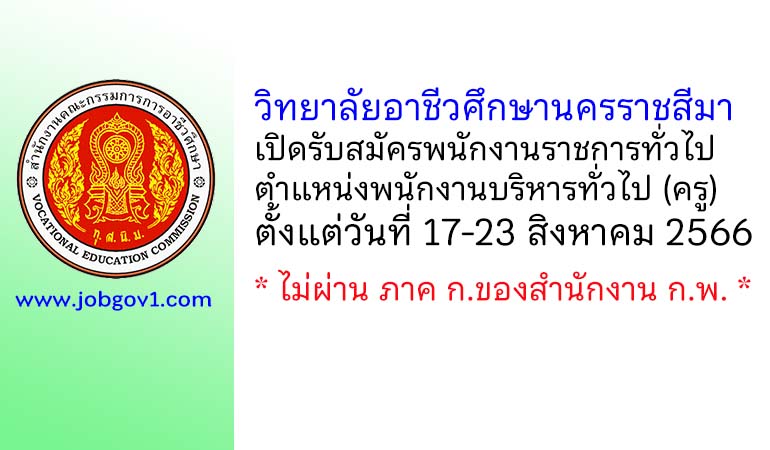 วิทยาลัยอาชีวศึกษานครราชสีมา รับสมัครพนักงานราชการทั่วไป ตำแหน่งพนักงานบริหารทั่วไป (ครู) ตั้งแต่วันที่ 17-23 สิงหาคม 2566