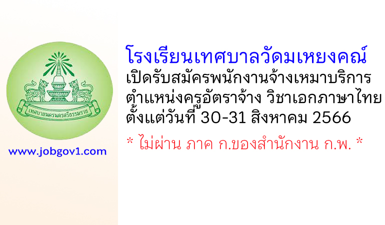 โรงเรียนเทศบาลวัดมเหยงคณ์ รับสมัครพนักงานจ้างเหมาบริการ ตำแหน่งครูอัตราจ้าง วิชาเอกภาษาไทย ตั้งแต่วันที่ 30-31 สิงหาคม 2566