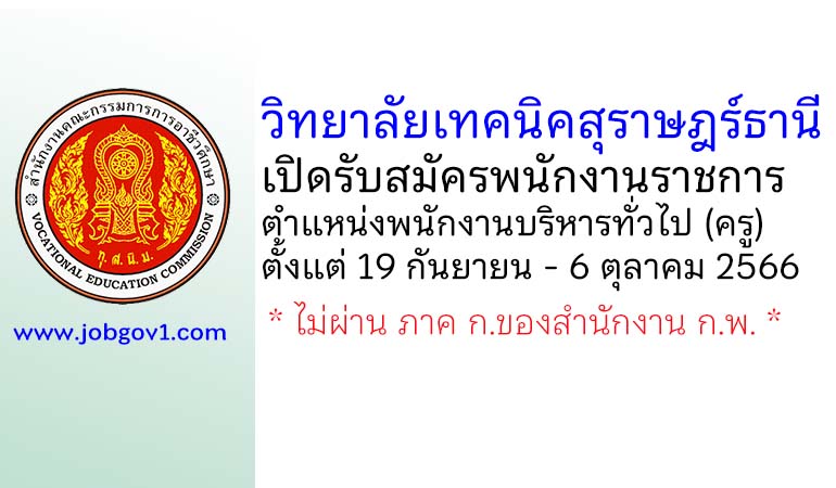 วิทยาลัยเทคนิคสุราษฎร์ธานี รับสมัครพนักงานราชการ ตำแหน่งพนักงานบริหารทั่วไป (ครู) ตั้งแต่ 19 กันยายน – 6 ตุลาคม 2566