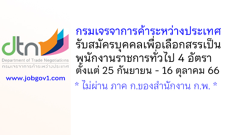 กรมเจรจาการค้าระหว่างประเทศ รับสมัครบุคคลเพื่อเลือกสรรเป็นพนักงานราชการทั่วไป 4 อัตรา ตั้งแต่ 25 กันยายน – 16 ตุลาคม 2566