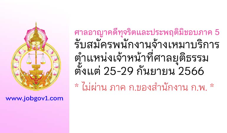 ศาลอาญาคดีทุจริตและประพฤติมิชอบภาค 5 รับสมัครพนักงานจ้างเหมาบริการ ตำแหน่งเจ้าหน้าที่ศาลยุติธรรม ตั้งแต่วันที่ 25-29 กันยายน 2566