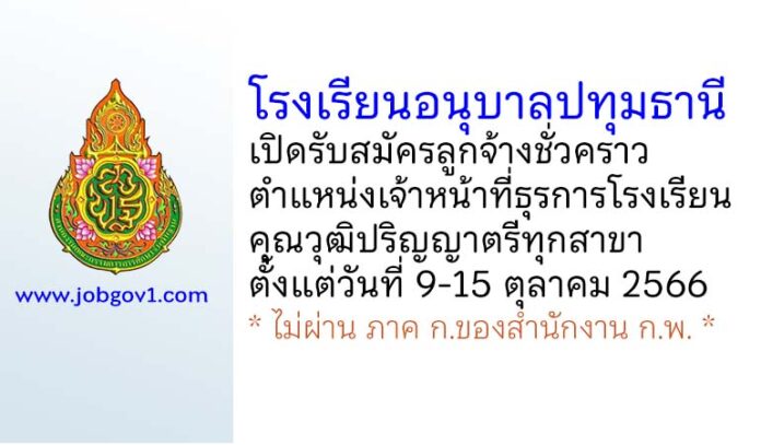 โรงเรียนอนุบาลปทุมธานี รับสมัครลูกจ้างชั่วคราว ตำแหน่งเจ้าหน้าที่ธุรการโรงเรียน ตั้งแต่วันที่ 9-15 ตุลาคม 2566
