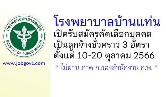 โรงพยาบาลบ้านแท่น รับสมัครคัดเลือกบุคคลเป็นลูกจ้างชั่วคราว 3 อัตรา ตั้งแต่วันที่ 10-20 ตุลาคม 2566