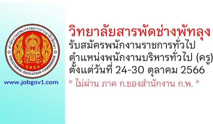 วิทยาลัยสารพัดช่างพัทลุง รับสมัครพนักงานราชการทั่วไป ตำแหน่งพนักงานบริหารทั่วไป (ครู) ตั้งแต่วันที่ 24-30 ตุลาคม 2566