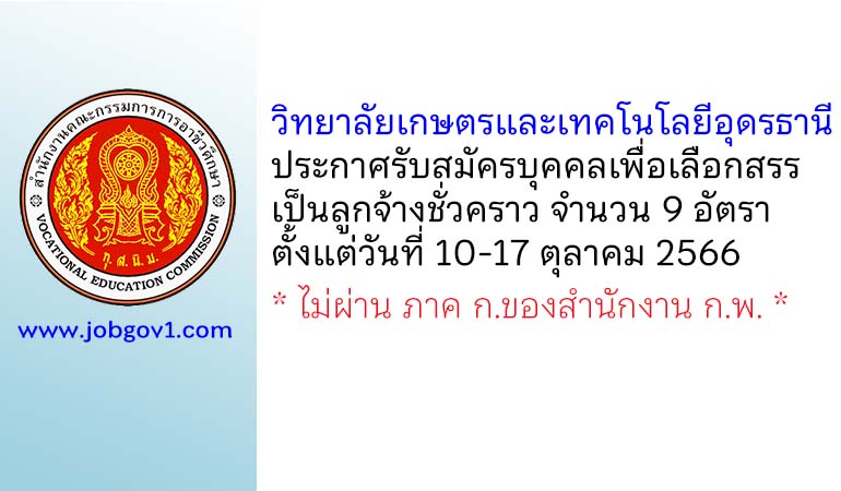 วิทยาลัยเกษตรและเทคโนโลยีอุดรธานี รับสมัครบุคคลเพื่อเลือกสรรเป็นลูกจ้างชั่วคราว 9 อัตรา ตั้งแต่วันที่ 10-17 ตุลาคม 2566