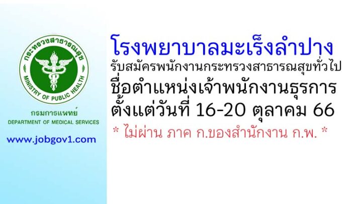 โรงพยาบาลมะเร็งลำปาง รับสมัครพนักงานกระทรวงสาธารณสุขทั่วไป ตำแหน่งเจ้าพนักงานธุรการ ตั้งแต่วันที่ 16-20 ตุลาคม 2566