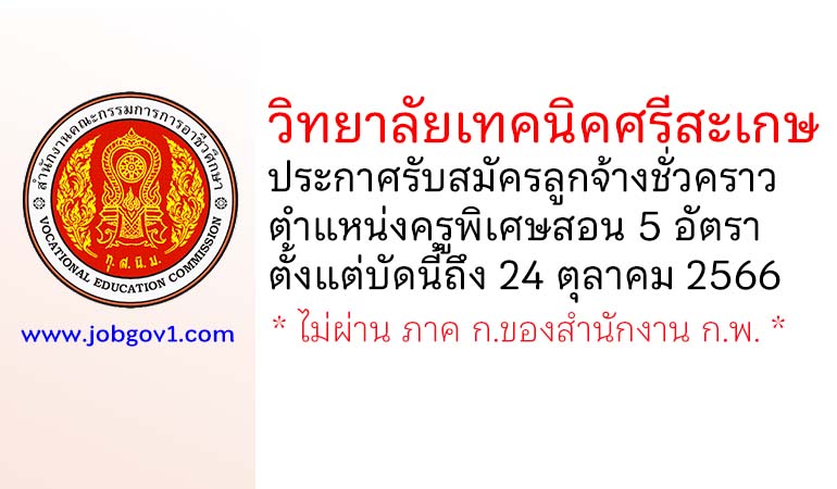 วิทยาลัยเทคนิคศรีสะเกษ รับสมัครลูกจ้างชั่วคราว ตำแหน่งครูพิเศษสอน 5 อัตรา ตั้งแต่บัดนี้ถึง 24 ตุลาคม 2566