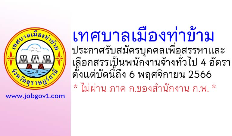 เทศบาลเมืองท่าข้าม รับสมัครบุคคลเพื่อสรรหาและเลือกสรรเป็นพนักงานจ้างทั่วไป 4 อัตรา ตั้งแต่บัดนี้ถึง 6 พฤศจิกายน 2566