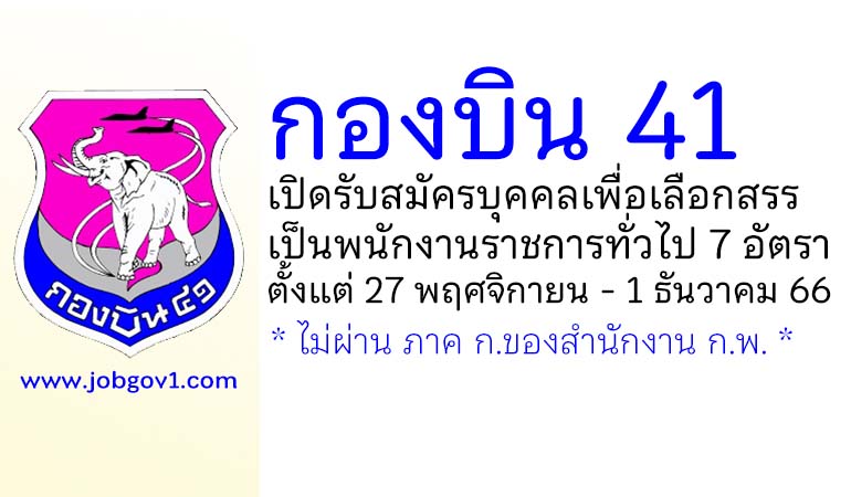 กองบิน 41 รับสมัครบุคคลเพื่อเลือกสรรเป็นพนักงานราชการทั่วไป 7 อัตรา ตั้งแต่ 27 พฤศจิกายน – 1 ธันวาคม 2566
