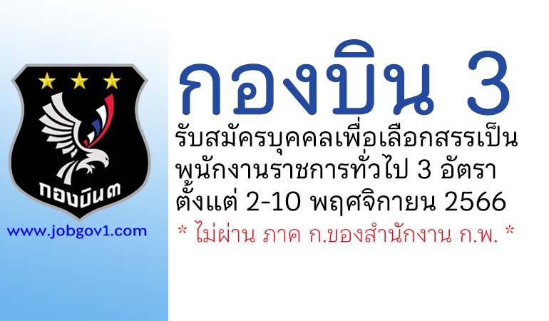กองบิน 3 รับสมัครบุคคลเพื่อเลือกสรรเป็นพนักงานราชการทั่วไป 3 อัตรา ตั้งแต่วันที่ 2-10 พฤศจิกายน 2566