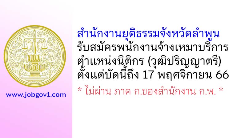 สำนักงานยุติธรรมจังหวัดลำพูน รับสมัครพนักงานจ้างเหมาบริการ ตำแหน่งนิติกร ตั้งแต่บัดนี้ถึง 17 พฤศจิกายน 2566