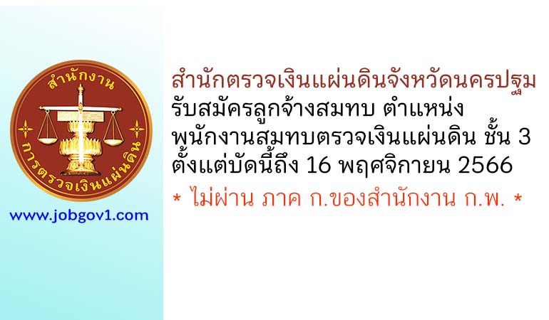 สำนักตรวจเงินแผ่นดินจังหวัดนครปฐม รับสมัครลูกจ้างสมทบ ตำแหน่งพนักงานสมทบตรวจเงินแผ่นดิน ชั้น 3 ตั้งแต่บัดนี้ถึง 16 พฤศจิกายน 2566