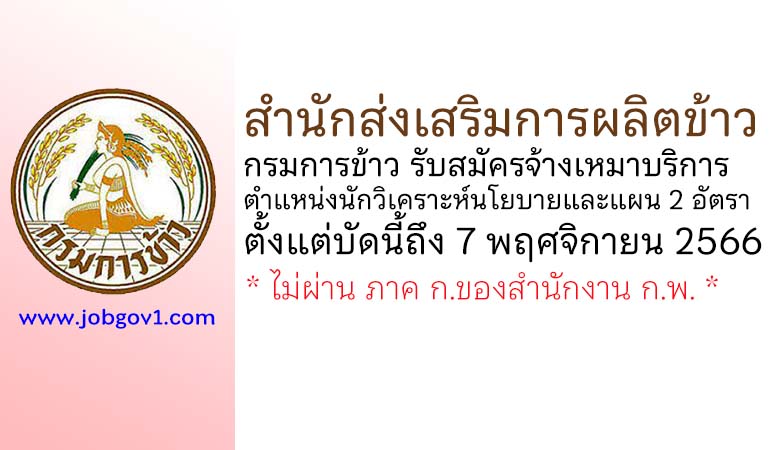 สำนักส่งเสริมการผลิตข้าว กรมการข้าว รับสมัครจ้างเหมาบริการ ตำแหน่งนักวิเคราะห์นโยบายและแผน 2 อัตรา ตั้งแต่บัดนี้ถึง 7 พฤศจิกายน 2566