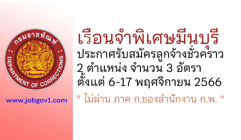 เรือนจำพิเศษมีนบุรี รับสมัครลูกจ้างชั่วคราว 3 อัตรา ตั้งแต่วันที่ 6-17 พฤศจิกายน 2566