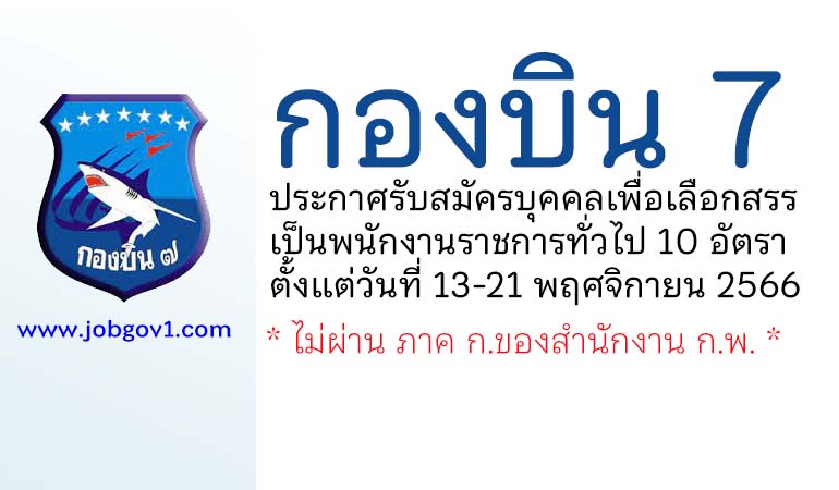 กองบิน 7 รับสมัครบุคคลเพื่อเลือกสรรเป็นพนักงานราชการทั่วไป 10 อัตรา ตั้งแต่วันที่ 13-21 พฤศจิกายน 2566