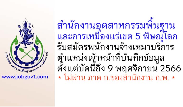 สำนักงานอุตสาหกรรมพื้นฐานและการเหมืองแร่เขต 5 พิษณุโลก รับสมัครพนักงานจ้างเหมาบริการ ตำแหน่งเจ้าหน้าที่บันทึกข้อมูล ตั้งแต่บัดนี้ถึง 9 พฤศจิกายน 2566