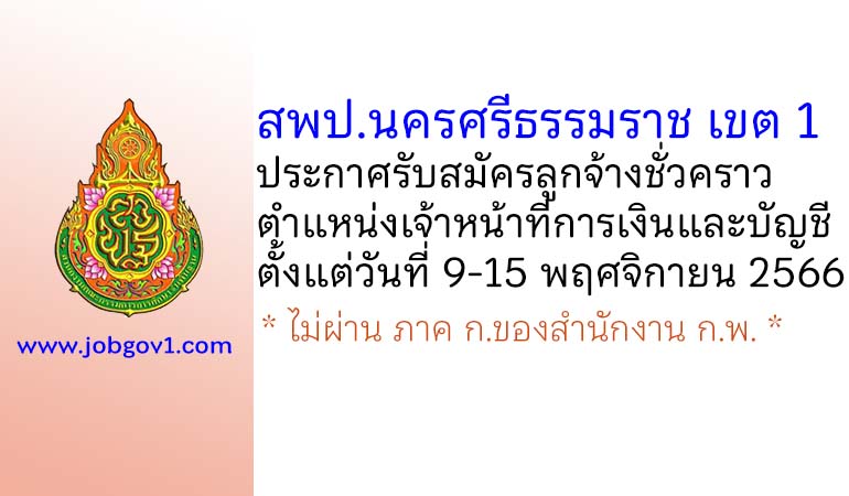สพป.นครศรีธรรมราช เขต 1 รับสมัครลูกจ้างชั่วคราว ตำแหน่งเจ้าหน้าที่การเงินและบัญชี ตั้งแต่วันที่ 9-15 พฤศจิกายน 2566