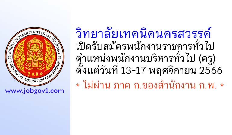 วิทยาลัยเทคนิคนครสวรรค์ รับสมัครพนักงานราชการทั่วไป ตำแหน่งพนักงานบริหารทั่วไป (ครู) ตั้งแต่วันที่ 13-17 พฤศจิกายน 2566