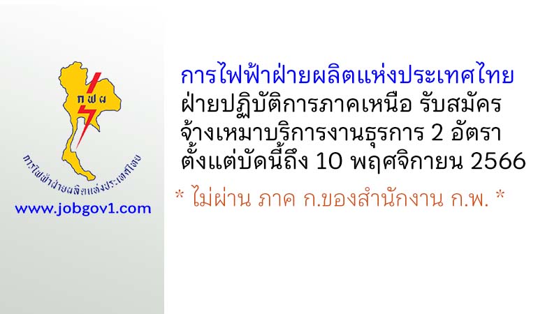 การไฟฟ้าฝ่ายผลิตแห่งประเทศไทย ฝ่ายปฏิบัติการภาคเหนือ รับสมัครจ้างเหมาบริการงานธุรการ 2 อัตรา ตั้งแต่บัดนี้ถึง 10 พฤศจิกายน 2566