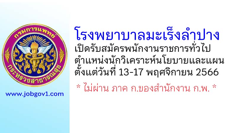โรงพยาบาลมะเร็งลำปาง รับสมัครพนักงานราชการทั่วไป ตำแหน่งนักวิเคราะห์นโยบายและแผน ตั้งแต่วันที่ 13-17 พฤศจิกายน 2566