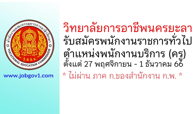 วิทยาลัยการอาชีพนครยะลา รับสมัครพนักงานราชการทั่วไป ตำแหน่งพนักงานบริการ (ครู) ตั้งแต่ 27 พฤศจิกายน – 1 ธันวาคม 2566